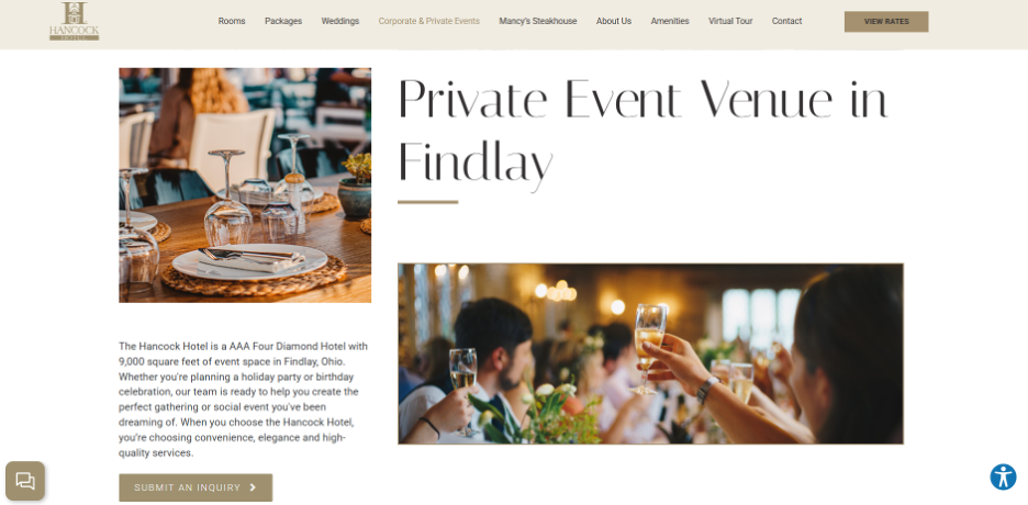The Hancock Hotel is a AAA Four Diamond luxury hotel located in downtown Findlay, Ohio. Known for its elegance and personalized service, it offers guests a blend of comfort, sophistication and convenience. For corporate events, the Hancock Hotel offers over 9,000 square feet of flexible event space, including the 5,200-square-foot Blanchard Ballroom. You can also find smaller rooms, such as the Flag City Room and Gaslight Private Dining Room.